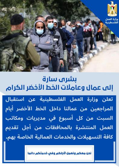 أعلنت وزارة العمل الفلسطينية، صباح اليوم الخميس، عن استقبال المراجعين من العمال في الداخل الفلسطيني "الخط الأخضر" أيام السبت من كل أسبوع في كافة مديريات ومكاتب الوزارة.