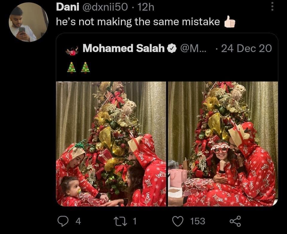 ونشر صلاح على حسابه بموقع إنستغرام صورة تجمعه وزوجته وابنتاه كيان ومكة، وخلفهم شجرة الكريسماس مع تعليق "ميري كريسماس".