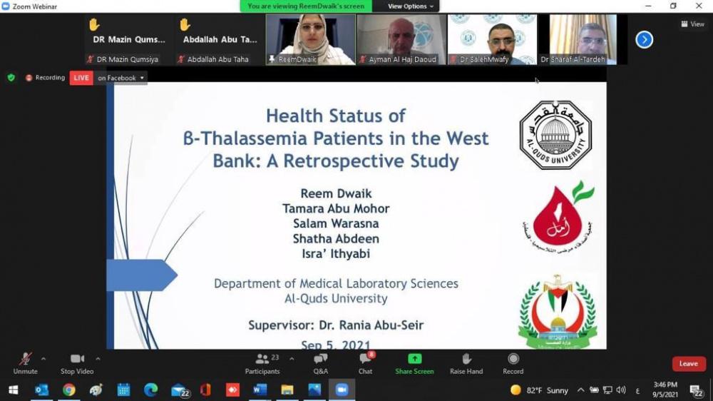نشرت مجلة Frontiers in Medicine العلمية المرموقة بحثًا بعنوان "الحالة الصحيّة لمرضى ثلاسيميا-بيتا في الضفة الغربية" لطالبات البكالوريوس في دائرة العلوم الطبية المخبرية في جامعة القدس وهن: ريم الدويك، تمارة أبو مهر، إسراء اذيابي، سلام وراسنة، شذى عابدين، تحت إشراف عميد كلية المهن الصحية د. رانيا أبو سير ضمن مساق مشروع التخرج للعام الأكاديمي 2018/2019.