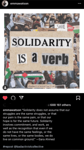 وأعادت الممثلة البريطانية التي اشتهرت بتجسيد دور هيرميون غرينجر، في سلسلة أفلام "هاري بوتر"، نشر تدوينة تضامنية مع الشعب الفلسطيني، لناشطة تدعى سارة أحمد، على حسابها في تطبيق أنستغرام.
