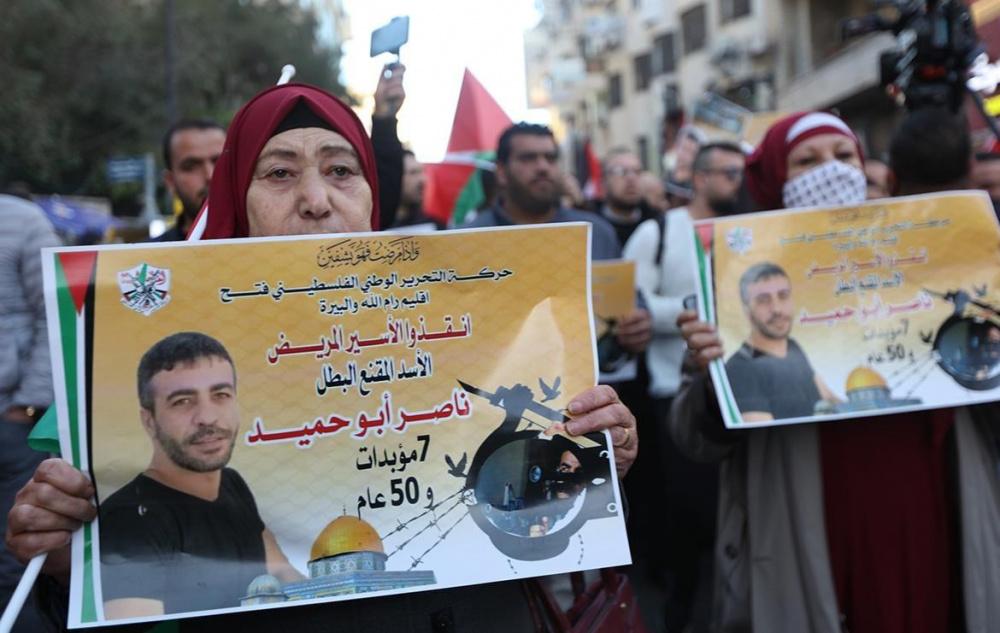 شارك مواطنون، مساء الاثنين، في وقفة ومسيرة دعم واسناد للأسير المريض ناصر أبو حميد، الذي يعيش ظروفا صحية صعبة تهدد حياته، خاصة بعد دخوله في حالة غيبوبة منذ الثلاثاء الماضي.