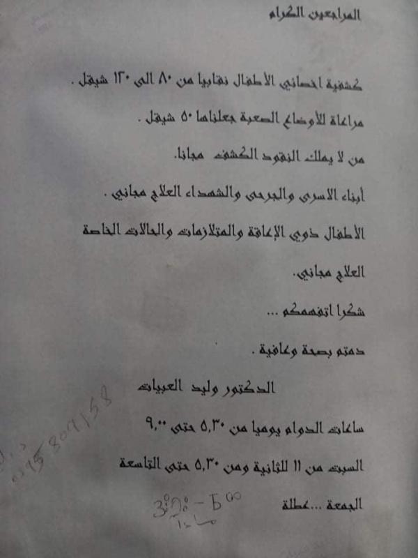 تفاعل رواد التواصل الاجتماعي في مختلف المناطق الفلسطينية، مع مبادرة طبيب الأطفال وحديثي الولادة وليد العبيات، حول تخفيض كشفيته إلى 50 شيكل، ومجانا لمن لا يملك المال، بعد أن تم تداول صورة علقت على باب العيادة الخاصة به.