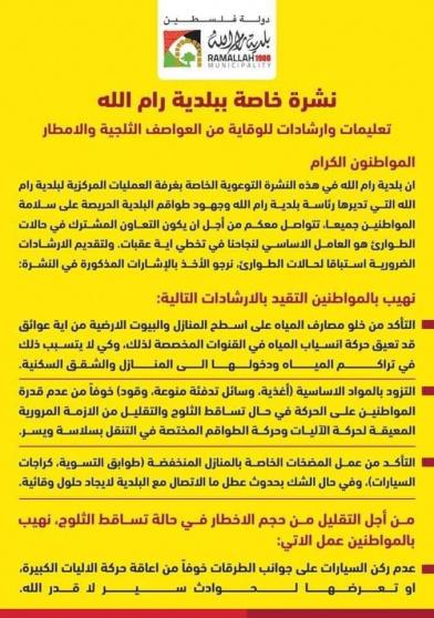أعدت غرفة العمليات المركزية في بلدية رام الله خطتها لاستقبال الثلوج المتوقعة بحسب الأرصاد الجوية الفلسطينية، وجاءت على النحو التالي: