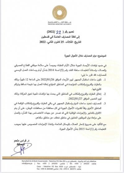 أصدرت سلطة النقد الفلسطينية تعميما، مساء الثلاثاء، للمصارف العاملة في فلسطين كافة، وحددت موعد دوام البنوك والمصارف خلال المنخفض الجوي القطبي المتوقع وصوله إلى البلاد غدا.