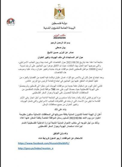 وفيما يلي البيان الصحفي حول آخر المستجدات في ملف الهويات وتغيير العنوان: