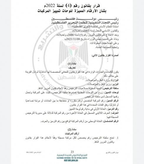 أصدر الرئيس محمود عباس اليوم الخميس، القرار بقانون رقم (4) لسنة 2022م بشأن الأرقام المميزة للوحات تمييز المركبات.