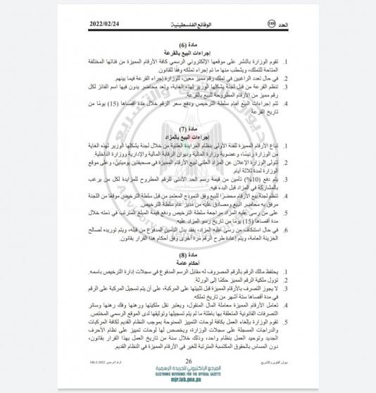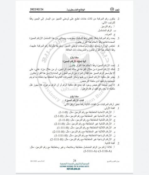 كما يحدد رقم المركبة بشكل تلقائي وفقا لتسلسل محوسب، ويستثنى من هذا التسلسل الأرقام المميزة المحددة فئاتها وفقا لأحكام هذا القرار بقانون.