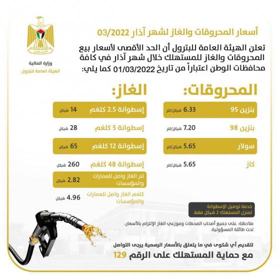 وبينت في بيان لها، اليوم الاثنين، أن لتر البنزين 95 سيباع بـ6.33 شيقل، ولتر البنزين 98 بـ27. 7 شيقل، ولتر السولار والكاز بـ5.65 شيقل، واسطوانة الغاز 12 كيلوغراما بـ 65 شيقلا.