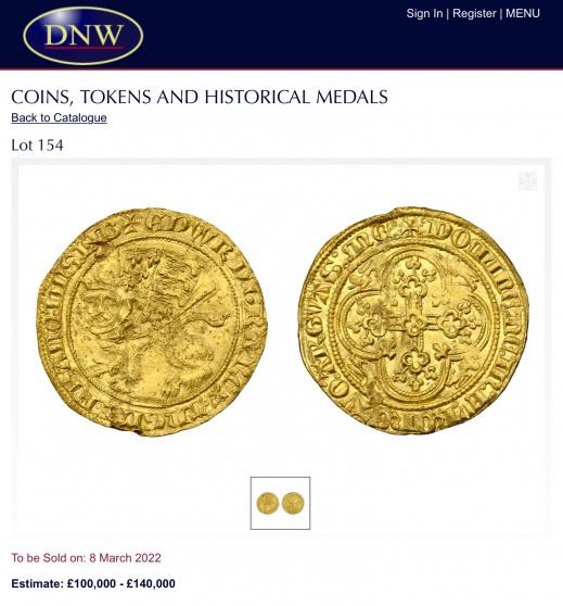 وأشارت دار المزادات إلى أن العملة الذهبية النادرة تعود إلى يناير/ كانون الثاني عام 1344، وقدمها الملك إدوارد الثالث بغرض تسهيل التجارة مع أوروبا، وظلت متداولة بين البريطانيين لمدة 7 أشهر فقط قبل أن يتم سحبها.