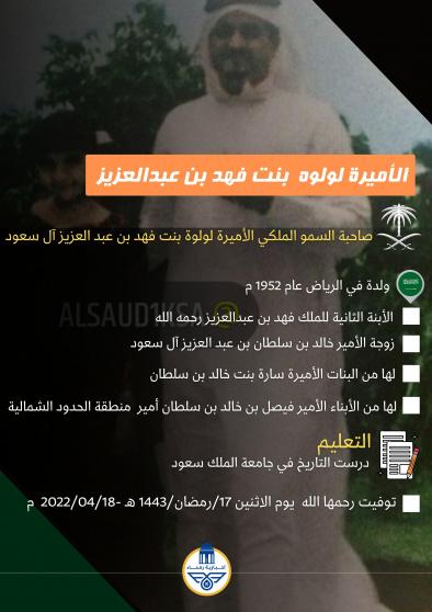 صاحبة السمو الملكي الأميرة لولوه بنت فهد بن عبدالعزيز ولدت في العاصمة الرياض عام 1952 وتوفيت يوم الإثنين عن عمر ناهز 70 عاما.