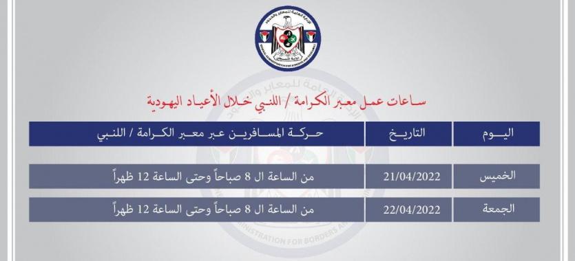 أعلنت الادارة العامة للمعابر والحدود، اليوم الثلاثاء، عن تعديل ساعات عمل معبر الكرامة خلال شهر نيسان - ابريل الحالي حسب الجدول التالي ، وذلك بسبب الاعياد اليهودية .