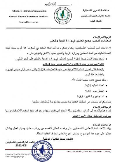 أعلن الاتحاد العام للمعلمين الفلسطينيين، عن إبرام اتفاقا جديدا مع الحكومة اليوم الخميس، يتضمن زيادة طبيعة العمل بنسبة 15% تُصرف 10% منها في بداية العام القادم و5% في بداية عام 2024.