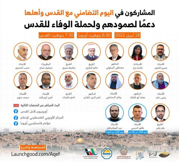 نظمت مؤسسة أوروبيون من اجل القدس وحملة الوفاء للقدس يوم تضامني مع القدس واهلها دعما لصمودهم والتبرع للحملة عبر التقنية المرئية بمشاركة شخصيات إسلامية وعربية من القدس وأوروبا والمغرب العربي.