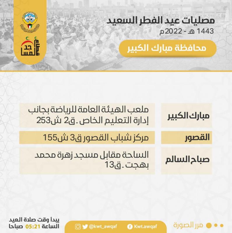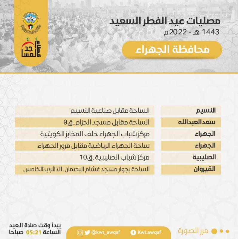 كما تتم صلاة العيد في محافظة الجهراء الكويتية بنفس التوقيت في النسيم وسعد العبدالله والجهراء والصليبية والقيروان، حيث يمكنك الإطلاع على التفاصيل من خلال الصور المرفقة بالأسفل.