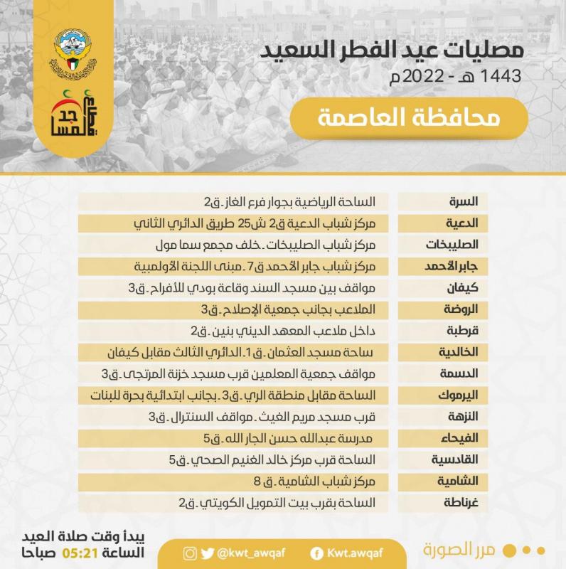 أعلنت وزارة الأوقاف والشؤون الإسلامية مصليات عيد الفطر السعيد 1443هـ 2022م#العاصمة #الجهراء #حولي #مبارك_الكبير #الأحمدي#الأوقاف #وزارة_الأوقاف #الكويت pic.twitter.com/SgtJbessbQ