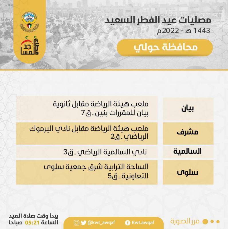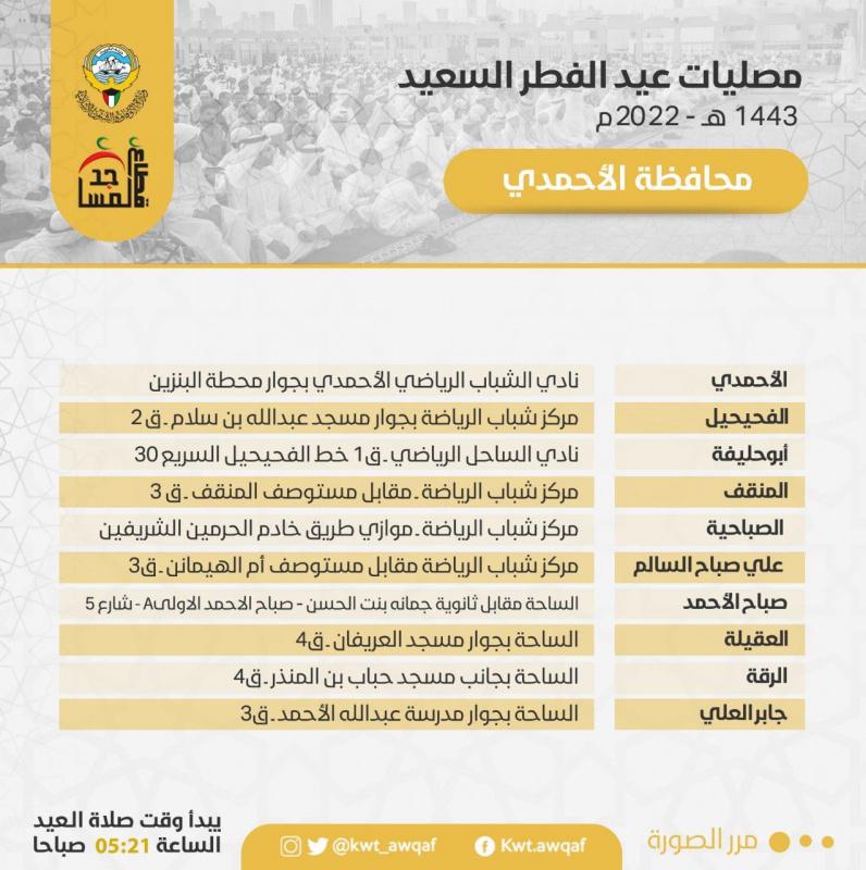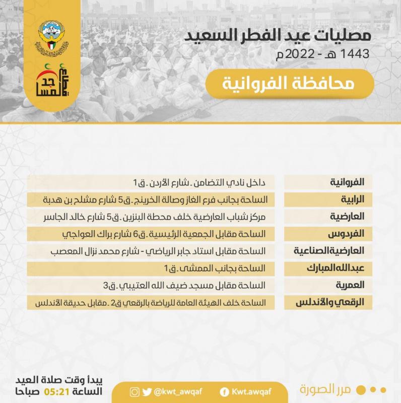 أعلنت وزارة الأوقاف والشؤون الإسلامية مصليات عيد الفطر السعيد 1443هـ 2022م#العاصمة #الجهراء #حولي #مبارك_الكبير #الأحمدي#الأوقاف #وزارة_الأوقاف #الكويت pic.twitter.com/V1y4ZEYNVR