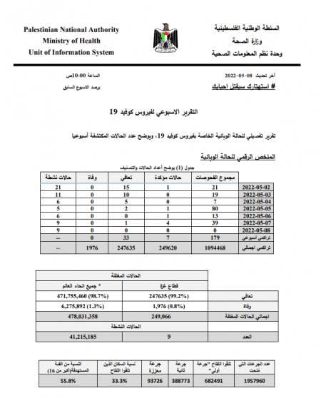 وفيما يلي التقرير الأسبوعي لفيروس كورونا في القطاع من تاريخ 1/5/2022 حتى 7/5/2022 :