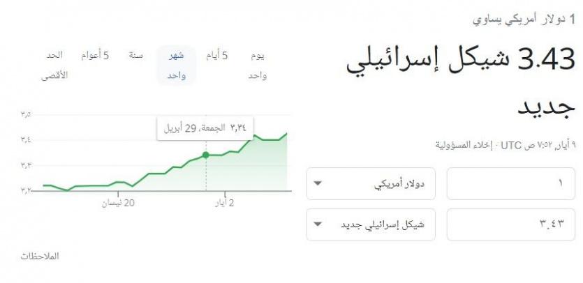ووصل سعر صرف الدولار مقابل الشيكل الاسرائيلي، الآن، 3.43 شيكل.
