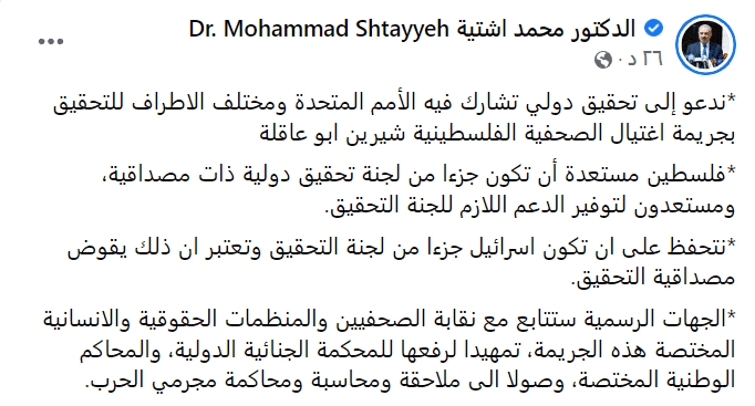ندعو إلى تحقيق دولي تشارك فيه الأمم المتحدة ومختلف الاطراف للتحقيق بجريمة اغتيال الصحفية الفلسطينية شيرين ابو عاقلة