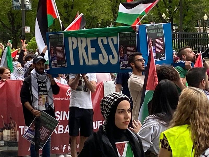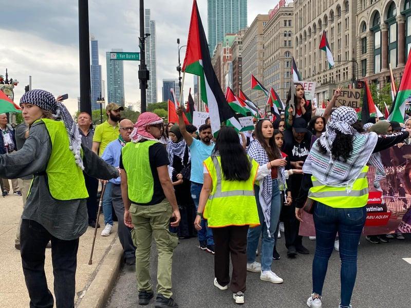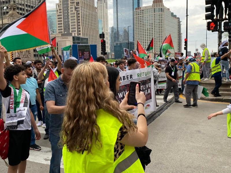 ورفع المشاركون الأعلام الفلسطينية ومفاتيح تعبر عن حق العودة وصور  الصحفية شيرين أبو عاقلة، منددين باستمرار الجرائم الاسرائيلية بحق المدنيين الفلسطينيين ومطالبين بمحاسبة قتلة الصحفية شيرين أبو عاقلة وذلك بدعوة من التحالف من أجل فلسطين "شيكاغو".
