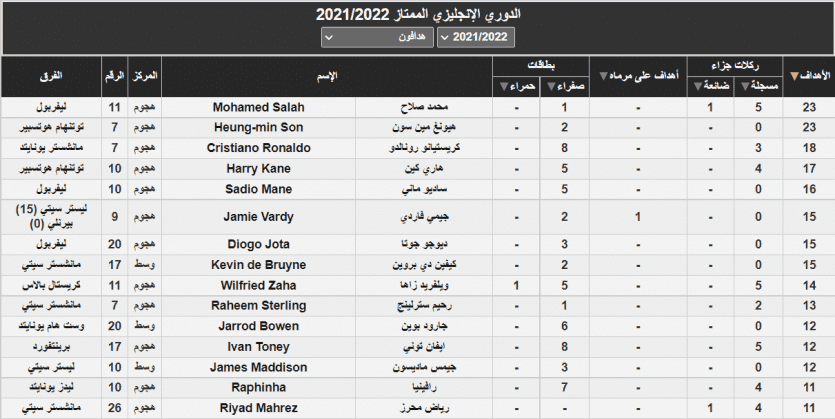 ترتيب الهدافين في الدوري الإنجليزي 2022 مركز صلاح: