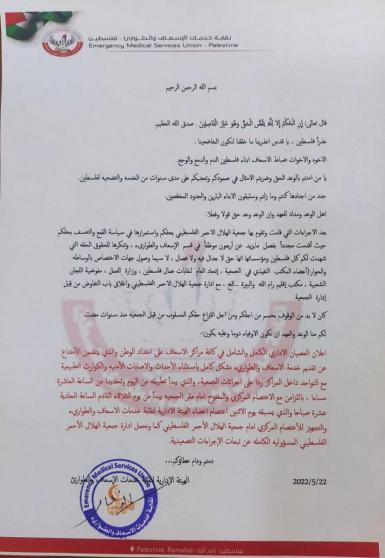 وفيما يلي نص بيان نقابة خدمات الإشعاف والطوارئ كما وصل موقع "رايــة":