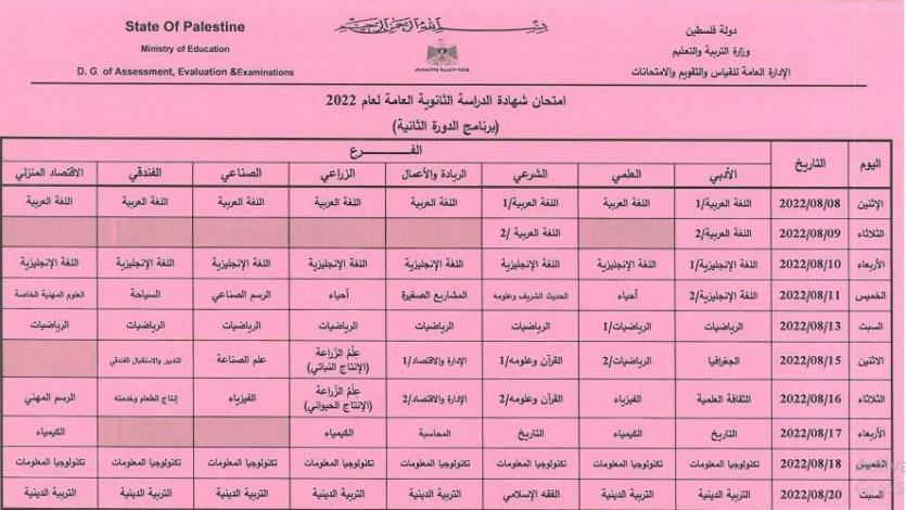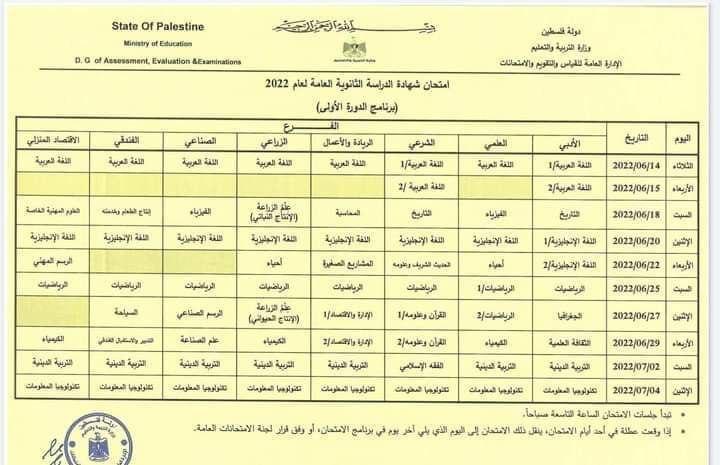 جدول امتحانات الثانوية العامة 2022 فلسطين للفرع العلمي والأدبي والشرعي والريادة والأعمال والزراعي والصناعي والفندقي والاقتصاد المنزل بعد التعديل متوفر في الصورة أسفل التقرير عبر راية.