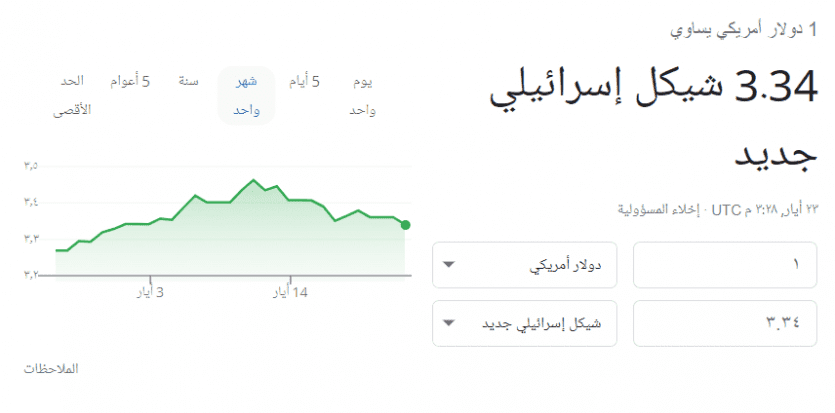 وبلغ سعر صرف الدولار مقابل الشيكل الان 3.34 شيكل.