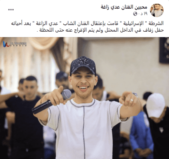وأفادت مصادر محلية بأن شرطة الاحتلال اعتقلت الفنان الشاب عدي زاغة بعد إحيائه حفل زفاف في الداخل الفلسطيني ولم يتم الإفراج عنه حتى اللحظة.