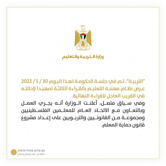 وفي سياق متصل، أعلنت الوزارة، في بيان لها، أنه يجري العمل- بالتعاون مع الاتحاد العام للمعلمين الفلسطينيين ومجموعة من القانونيين والتربويين- على إعداد مشروع قانون حماية المعلم.