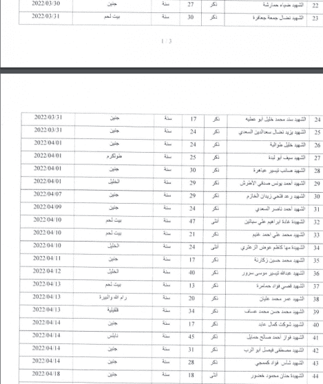 نشرت وزارة الصحة الفلسطينية، اليوم الخميس، حصيلة تتضمن عدد وأسماء الشهداء الفلسطينيين الذين ارتقوا برصاص قوات الاحتلال الإسرائيلي منذ بداية العام الجاري 2022.