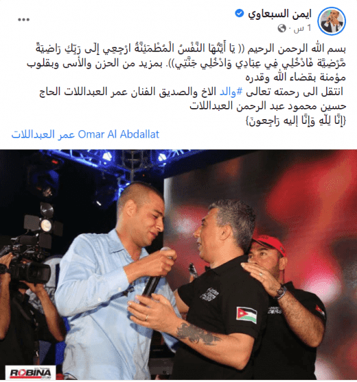 وكتب الفنان أيمن السبعاوي عبر فيسبوك: "بسم الله الرحمن الرحيم (( يَا أَيَّتُهَا النَّفْسُ الْمُطْمَئِنَّةُ ارْجِعِي إِلَى رَبِّكِ رَاضِيَةً مَّرْضِيَّة فَادْخُلِي فِي عِبَادِي وَادْخُلِي جَنَّتِي)). بمزيد من الحزن والأسى وبقلوب مؤمنة بقضاء الله وقدره انتقل الى رحمته تعالى #والد الاخ والصديق الفنان عمر العبداللات الحاج حسين محمود عبد الرحمن العبداللات {إِنَّا لِلّهِ وَإِنَّا إليه رَاجِعونَ}".\