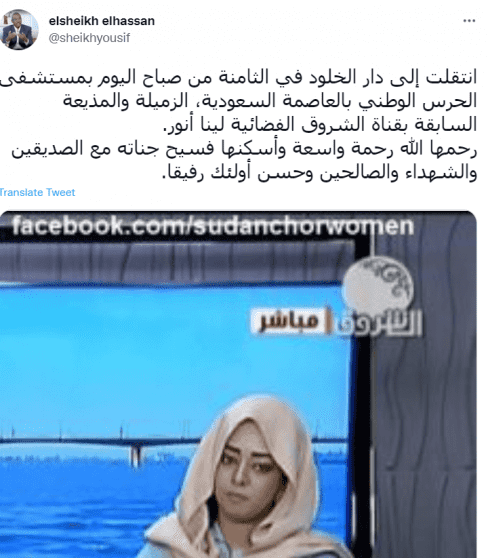 من جانبه، قال المحرر الصحفي معمر السوداني في تغريدة نعى من خلالها زميلته الراحلة: "وفاة المذيعة #السودانية بقناة “الشروق” الفصائية سابقا #لينا_انور بعد عناء مع المرض ،نسأل الله أن يتغمدها بواسع الرحمة والمغفرة ويلهم أهلها الصبر والسلوان".
