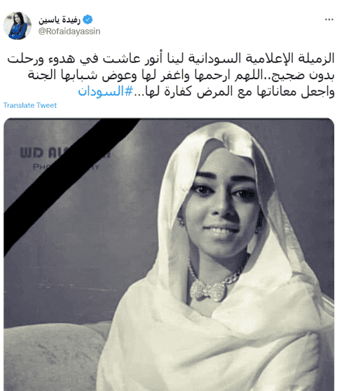وكتبت الإعلامية رفيدة ياسين عبر تويتر: "الزميلة الإعلامية السودانية لينا أنور عاشت في هدوء ورحلت بدون ضجيج..اللهم ارحمها واغفر لها وعوض شبابها الجنة واجعل معاناتها مع المرض كفارة لها".