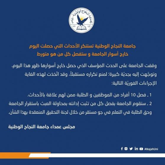 قرر مجلس عمداء جامعة النجاح الوطنية، فصل 10 أفراد من الموظفين و الطلبة ممن لهم علاقة بالأحداث التي حصلت خارج أسوار الجامعة ظهر اليوم الأربعاء.
