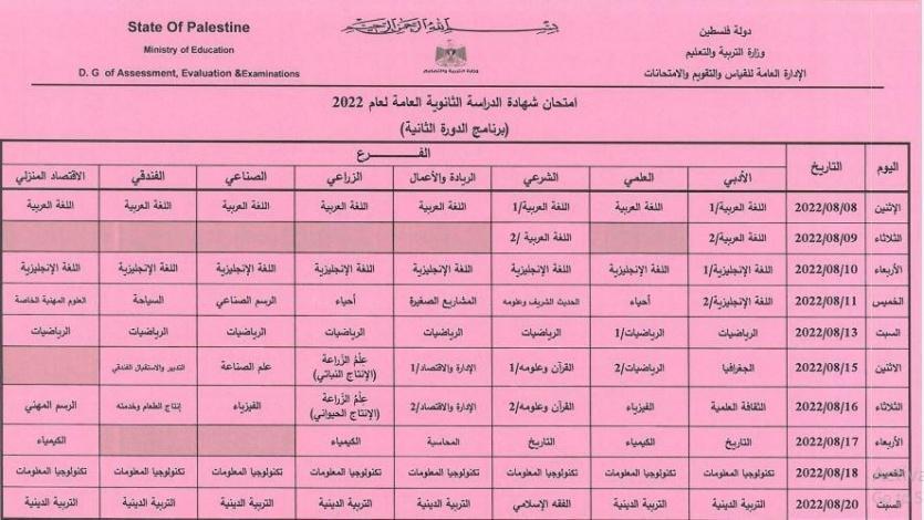 جدول امتحانات التوجيهي 2022 الدورة الثانية: