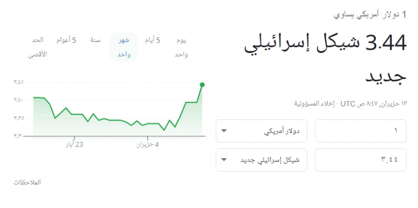 شهد سعر صرف الدولار الأمريكي أمام الشيكل الإسرائيلي قفزة جديدة وملموسة، ليصعد إلى 3.44 شيكل في التداولات المصرفية الان، وهو أعلى سعر للدولار أمام العملة الإسرائيلية منذ 12 أيار/مايو الماضي.