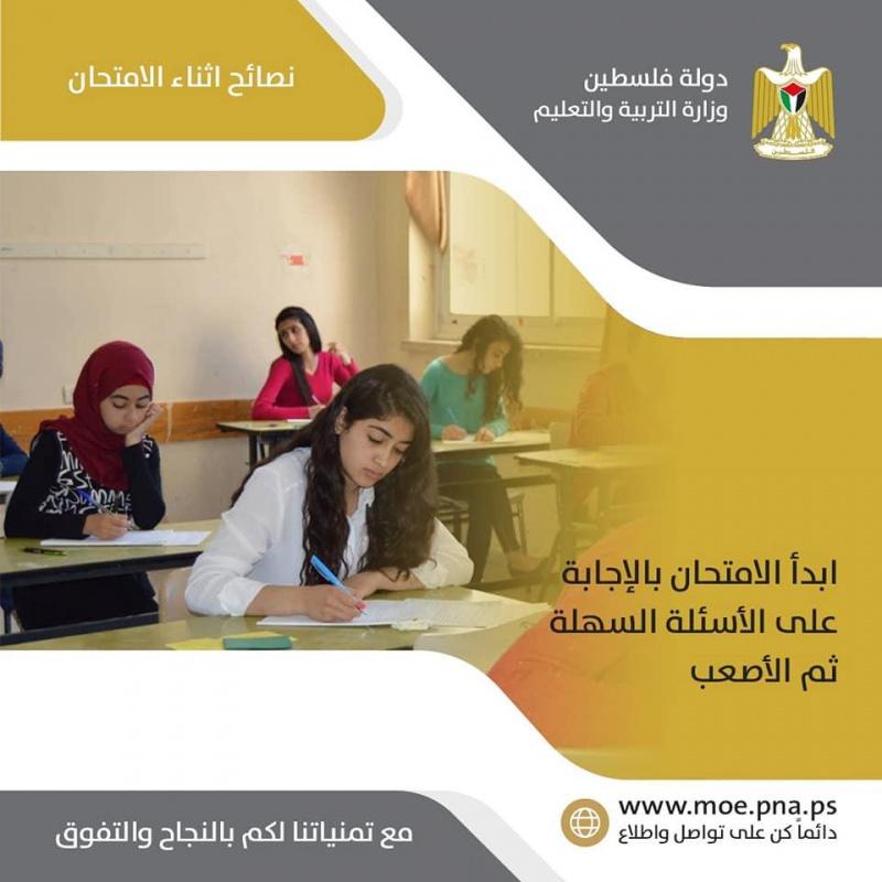 أصدرت وزارة التربية والتعليم اليوم الاثنين، مجموعة من النصائح لطلبة الثانوية العامة "التوجيهي"، وذلك مع اقتراب بدء الامتحانات، حيث من المقرر البدء بها يوم غدٍ الثلاثاء في كافة مدارس فلسطين ومدارس فلسطين بالخارج.