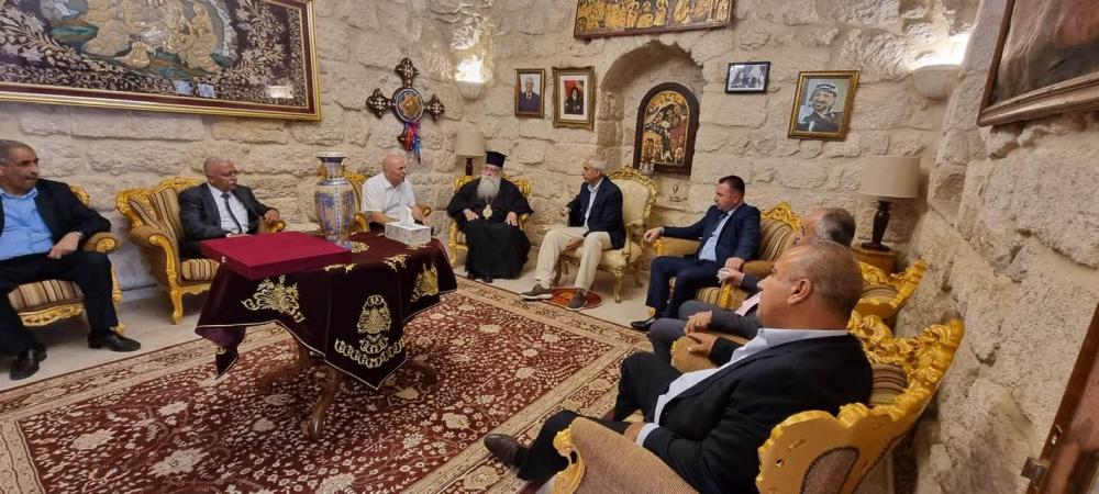 وبدأت الزيارة بزيارة كنيسة المهد، وكان في استقبالهم سيادة المطران بندكتوس ورؤساء البلديات الثلاث بيت لحم وبيت ساحور وبيت جالا، واطلع الوفد على الكنيسة واحتياجاتها وبعدها تم التوجه الى بلدية بيت ساحور.