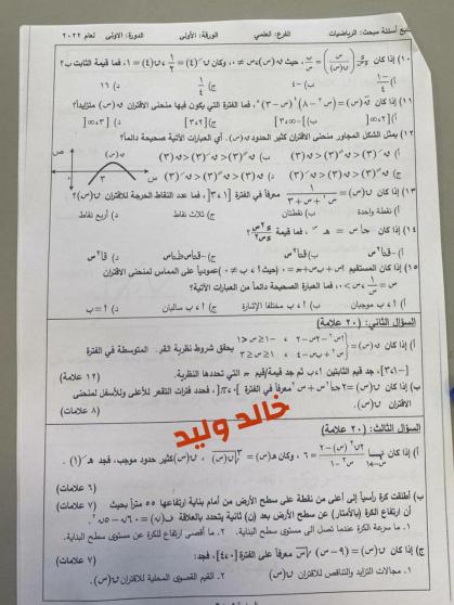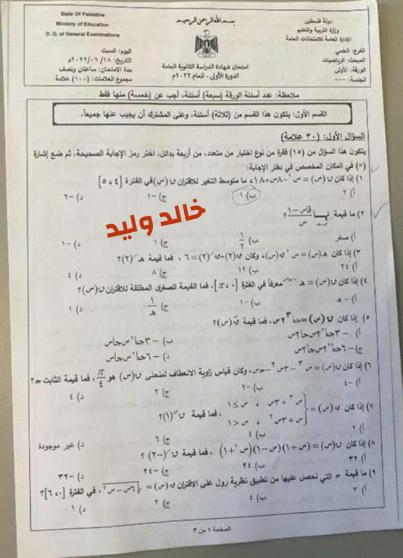 إجابات امتحان الرياضيات 1 الورقة الأولى للثانوية العامة 2022 توجيهي فلسطين الفرع العلمي