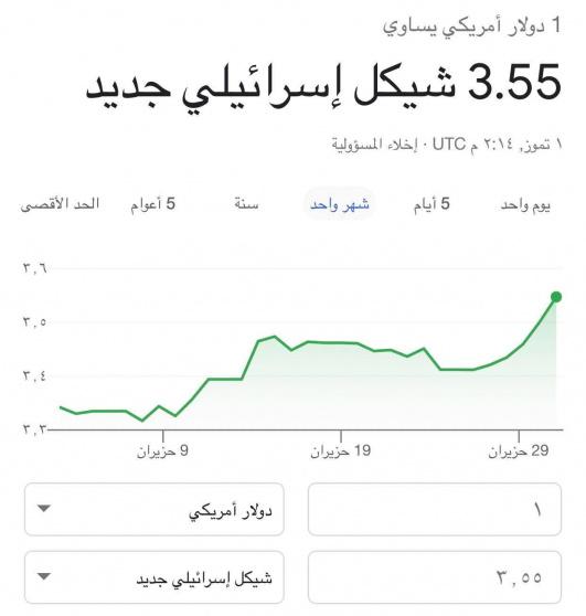 ووصل سعر صرف الدولار مقابل الشيكل الآن في قطاع غزة والضفة الغربية إلى 3.55 شيكل، فيما كان في ساعات الصباح 3.50.