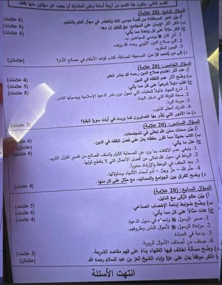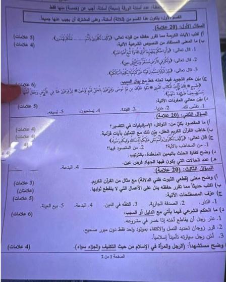 وفي آخر امتحان للفرع الشرعي وهو القرآن الكريم وعلومه الورقة الأولى حيث وُصِفَ بالسهل والميسر والمباشر والأسئلة من المنهاج، وهناك أسئلة مكررة من سنوات سابقة للفرع الشرعي فلسطين.