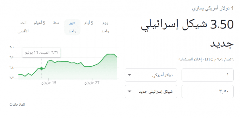 سجّل سعر صرف الدولار الأمريكي انخفاضا أمام الشيكل الإسرائيلي في فلسطين، مساء اليوم الاثنين 4 يوليو 2022.