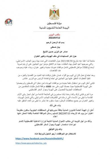 وقال: نيابة عن الرئيس محمود عباس، أعلن عن اسماء دفعة جديدة من الحاصلين على موافقات الهويات من المحافظات الجنوبية وعددها 4000 موافقة، على أن نستكمل العدد الذي اعلنا عنه اليوم (أمس الثلاثاء) "5500" غدا (اليوم الأربعاء).