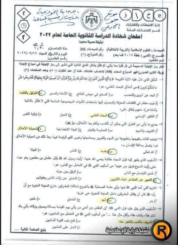 أجوبة امتحان العلوم الإسلامية توجيهي الأردن 2022: