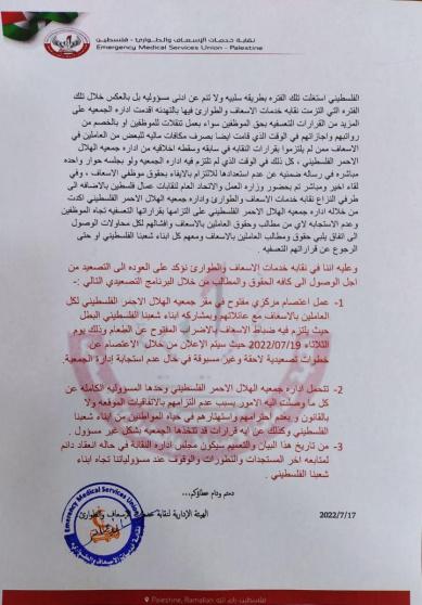 أعلنت نقابة الإسعاف والطوارئ اليوم الأحد 17 يوليو، تجديد فعاليتها الاحتجاجية، عقب اتخاذ إدارة جمعية الهلال الأحمر الفلسطيني "قرارات تعسفية" بحق الموظفين.