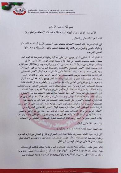 وحملت النقابة، جمعية الهلال الأحمر المسؤولية عما آلت إليه الأمور بسبب "عدم التزامها بالاتفاقيات الموقعة".