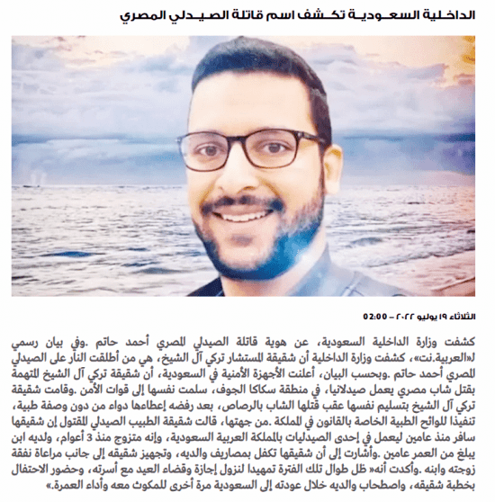 ونقلت الصحيفة أن موقع "العربية نت" نشر أن "وزارة الداخلية كشفت أن ‬شقيقة‭ ‬المستشار‭ ‬تركي‭ ‬آل‭ ‬الشيخ،‭ ‬هي‭ ‬من‭ ‬أطلقت‭ ‬النار‭ ‬على‭ ‬الصيدلي‭ ‬المصري‭ ‬أحمد‭ ‬حاتم".