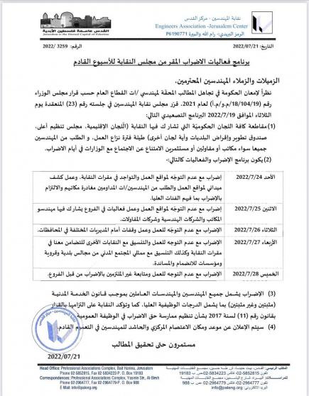 وبينت أن الاضراب يشمل جميع المهندسين والمهندسات العاملين بموجب قانون الخدمة المدنية بما يشمل الدرجات الوظيفية العليا.