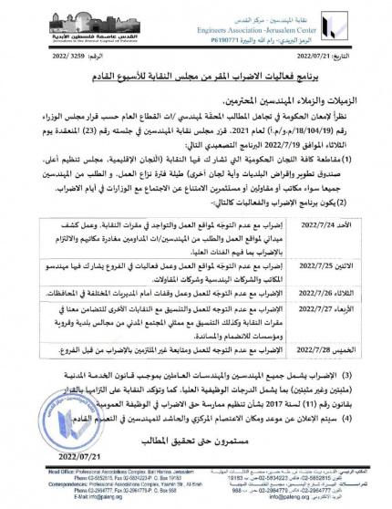 وأكدت نقابة المهندسين أنه سيتم الإعلان عن موعد ومكان الاعتصام المركزي والحاشد للمهندسين في التعميم القادم.